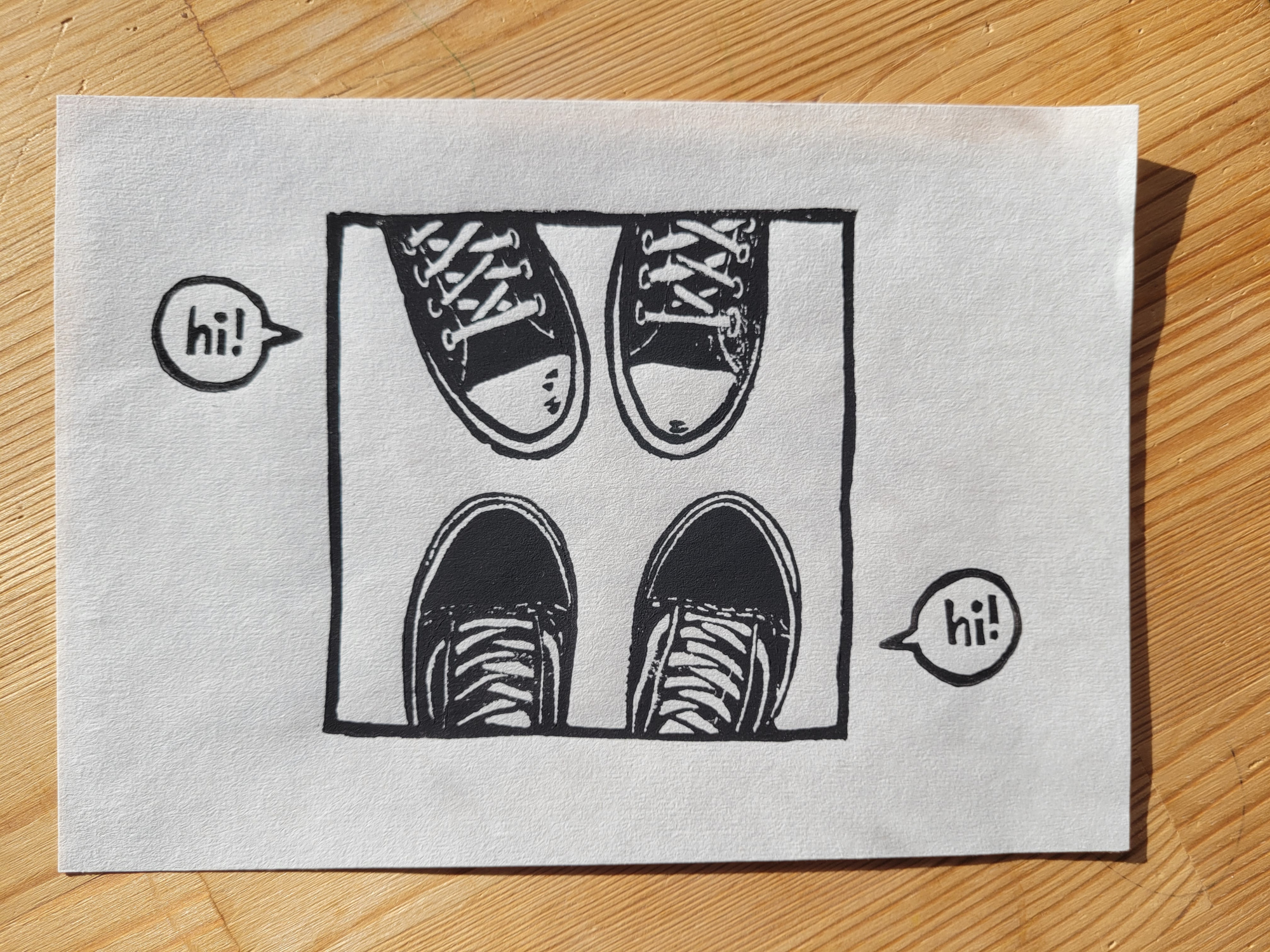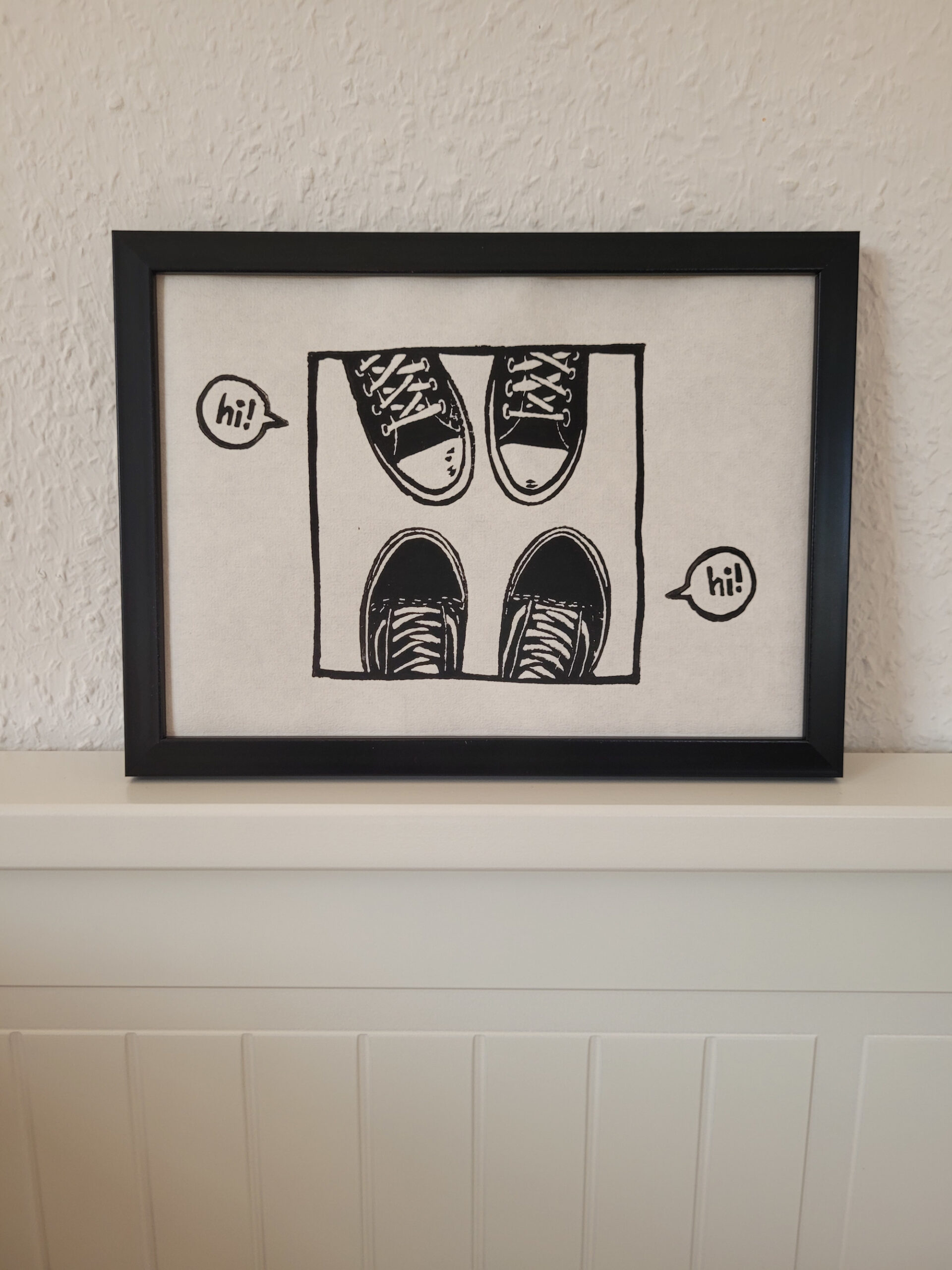 Die Turnschuhe sind mit einer selbstgeschnitzten Vinylplatte auf feinstes Reispapier (60g/m²) gedruckt. Jedes Exemplar ist ein handgefertigtes Unikat, kleinere Unterschiede in der Ausführung sind daher Teil des Charmes. Die erste Auflage ist auf 12 Stück limitiert. Alle Drucke sind signiert und mit Titel versehen.
