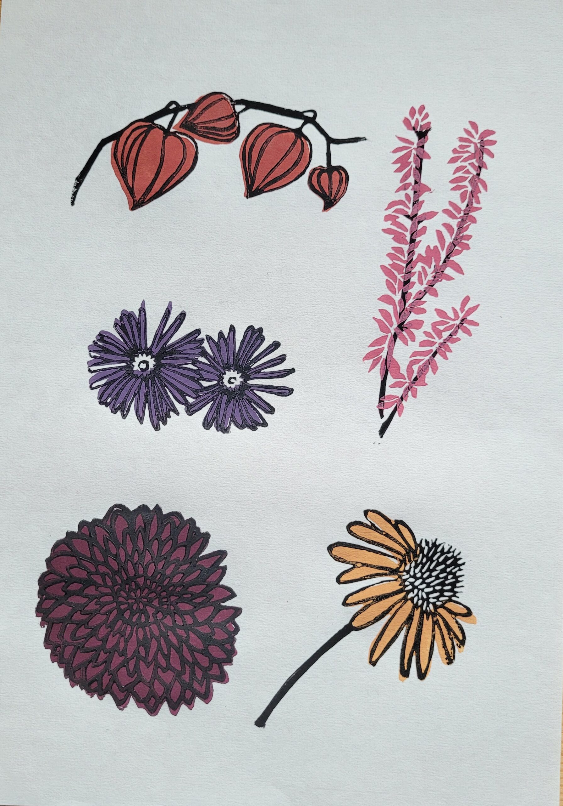 Die Blumen sind jeweils in zwei Schichten mit selbstgeschnitzten Vinylplatten auf feinstem Reispapier (60g/m²) gedruckt. Jedes Exemplar ist ein handgefertigtes Unikat, kleinere Unterschiede in der Ausführung sind daher Teil des Charmes. Die erste Auflage ist auf 9 Stück limitiert. Alle Drucke sind signiert und mit Titel versehen.