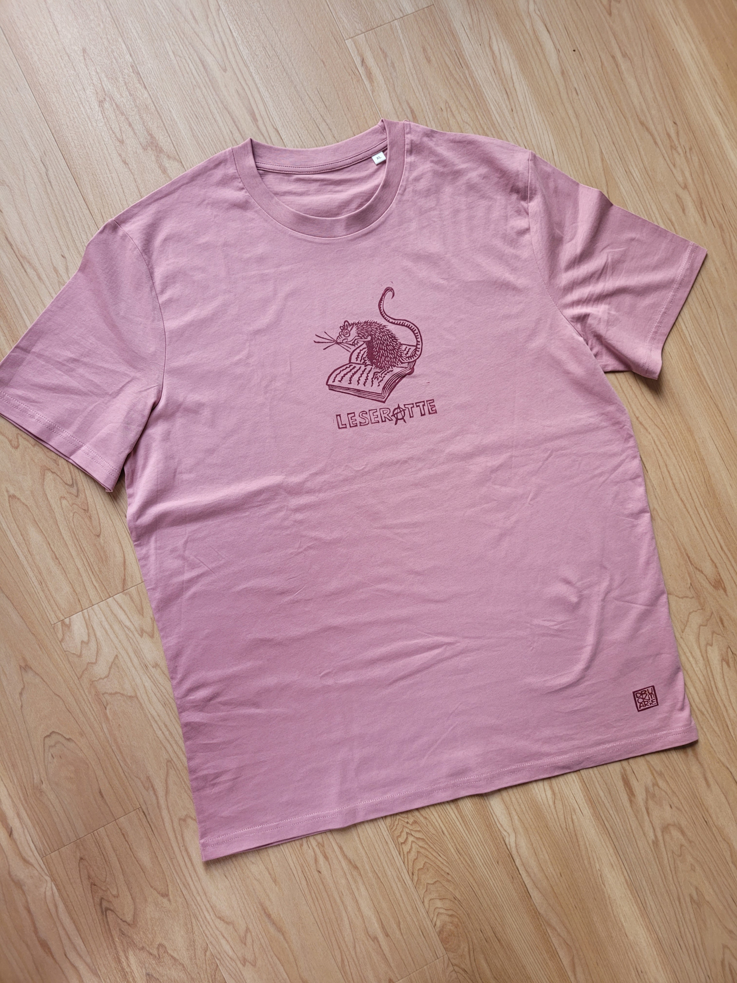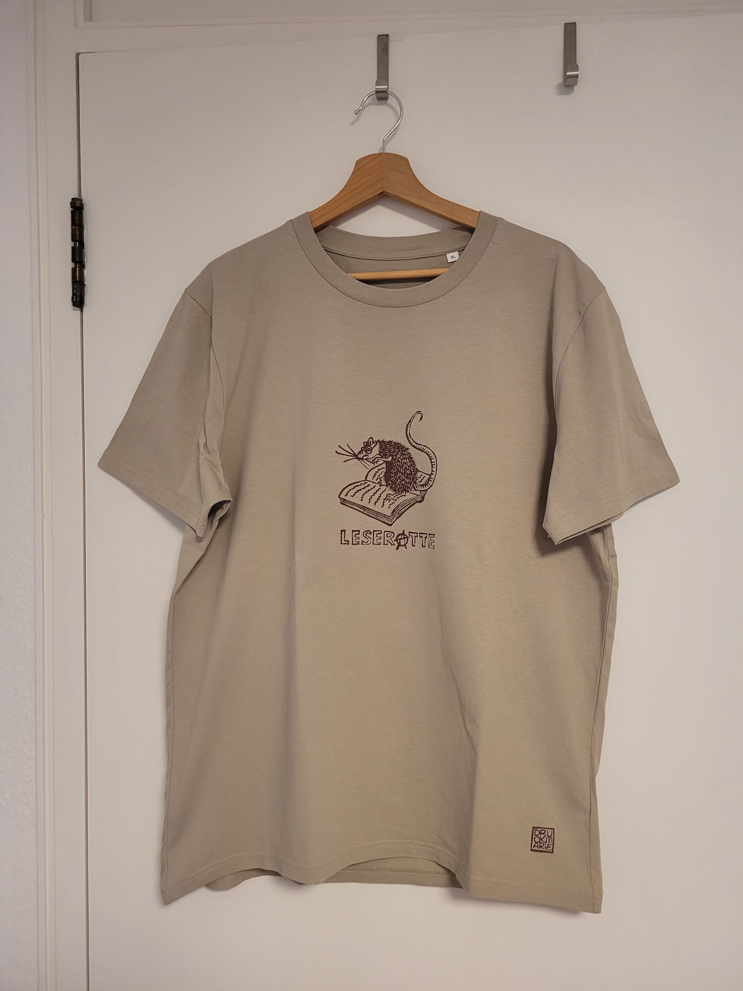 T-Shirt für Erwachsene, unisex, mit buchbesessener Ratte, aus Biobaumwolle, fair produziert und handbedruckt. Falls deine Größe nicht hier angeboten wird oder dir die Farben nicht gefallen, schreib mir gerne eine Nachricht.
