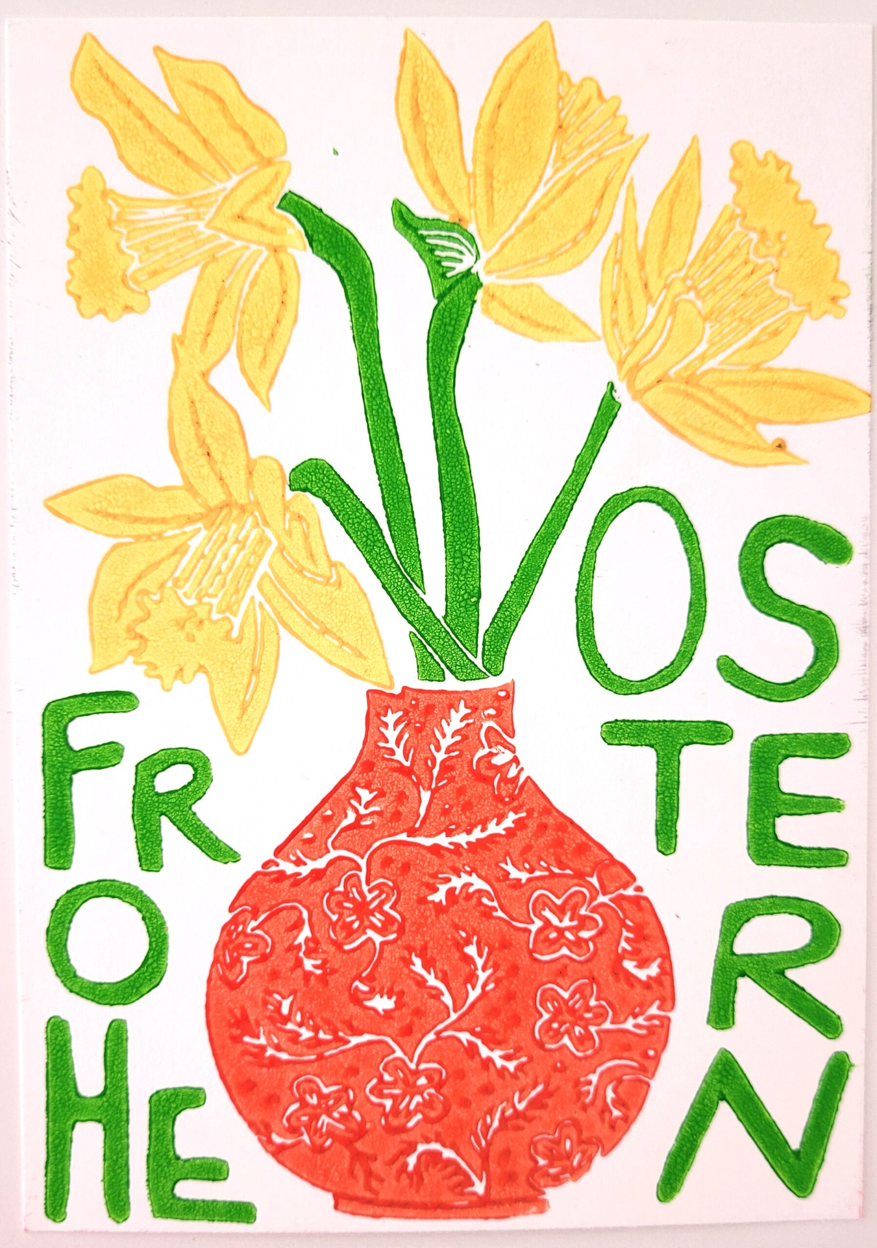 Das Motiv ist mit einer selbstgeschnitzten Linolplatte im Puzzledruckverfahren auf eine Postkarte aus weißem Kraftpapier (300g/m², 100% recycelt) gedruckt. Sie hat A6-Format (14,8 x 10,5 cm). Jedes Exemplar ist ein handgefertigtes Unikat, kleinere Unterschiede in der Ausführung sind daher Teil des Charmes.